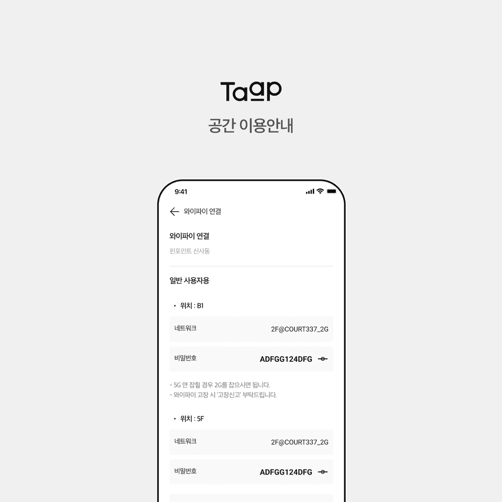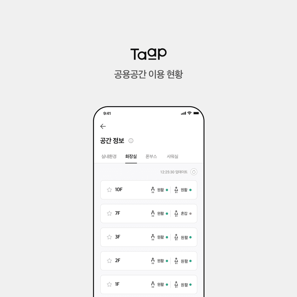 화장실, 샤워실 등의 공용공간과 공용기기의 이용현황을 실시간으로 확인